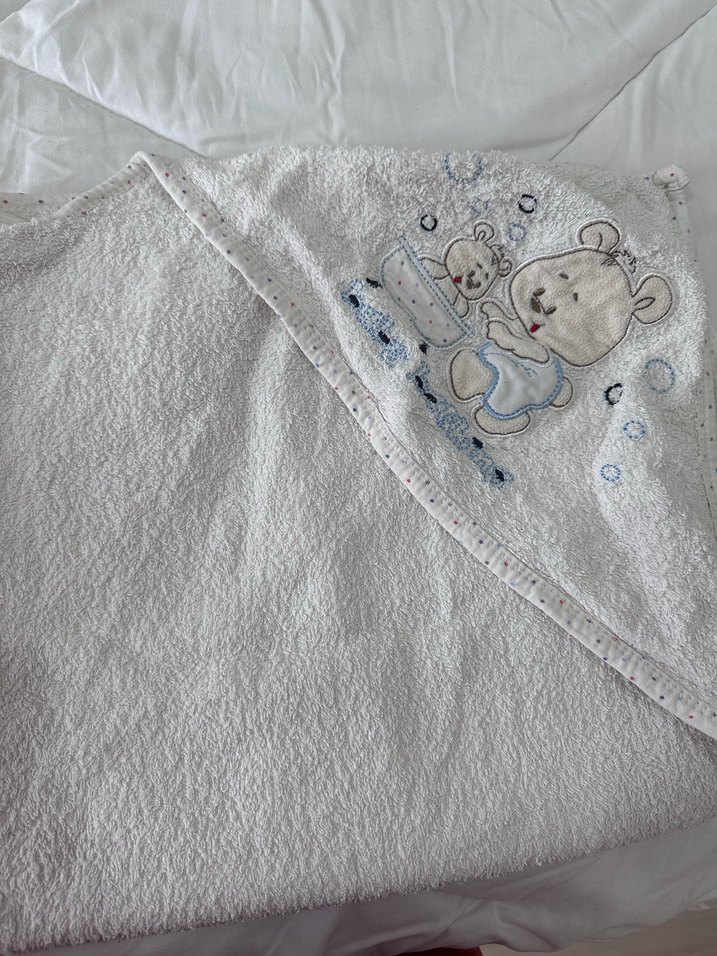 Pastel beyaz renkte, nakışlı ayıcık desenli yumuşak ve emici kumaştan erkek çocuk bornozu.