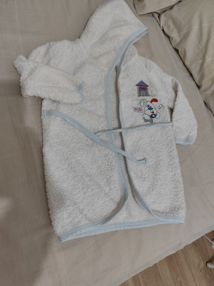 Pastel mavi kenarlıklı beyaz erkek çocuk bornozu, yumuşak dokulu ve göğsünde nakışlı eğlenceli desen bulunur. Kemerli, rahat ve sıcak tutar.