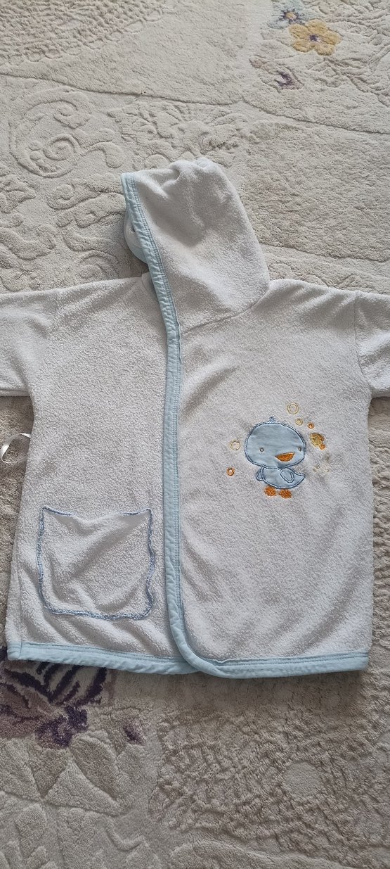 Erkek çocuk bornozu, yumuşak gri kumaş, kapüşonlu ve nakışlı ördek desenlidir. Ön cep ve açık mavi kenarlık bulunur.