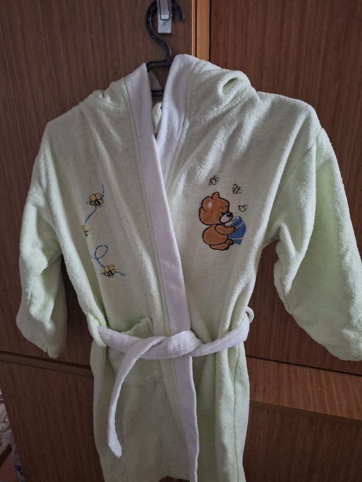 Yumuşak kumaşlı yeşil erkek çocuk bornozu, nakışlı ayı ve arı desenleri, kapüşonlu ve kemerli.