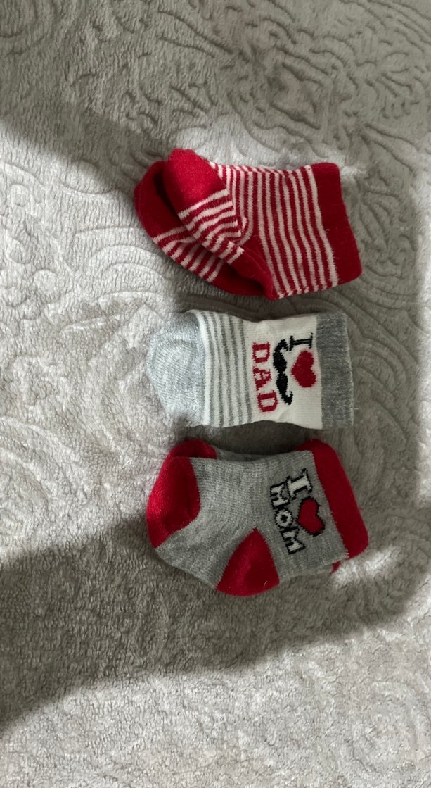 Kırmızı ve gri renklerde, nakışlı desenli erkek çocuk çorapları. Bir çiftinde 'DAD' yazısı bulunur. Rahat ve eğlenceli tasarım.