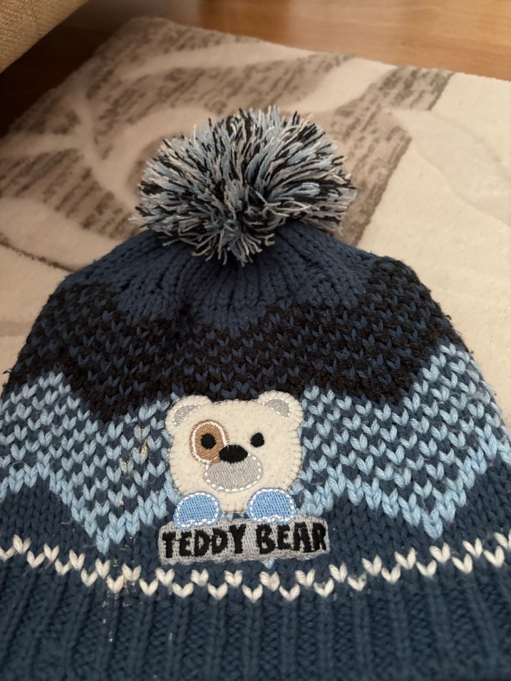 Üstünde ponpon ve renkli nakışlı ayı figürü bulunan gri örgü erkek çocuk bere. Rahat sokak stili.
