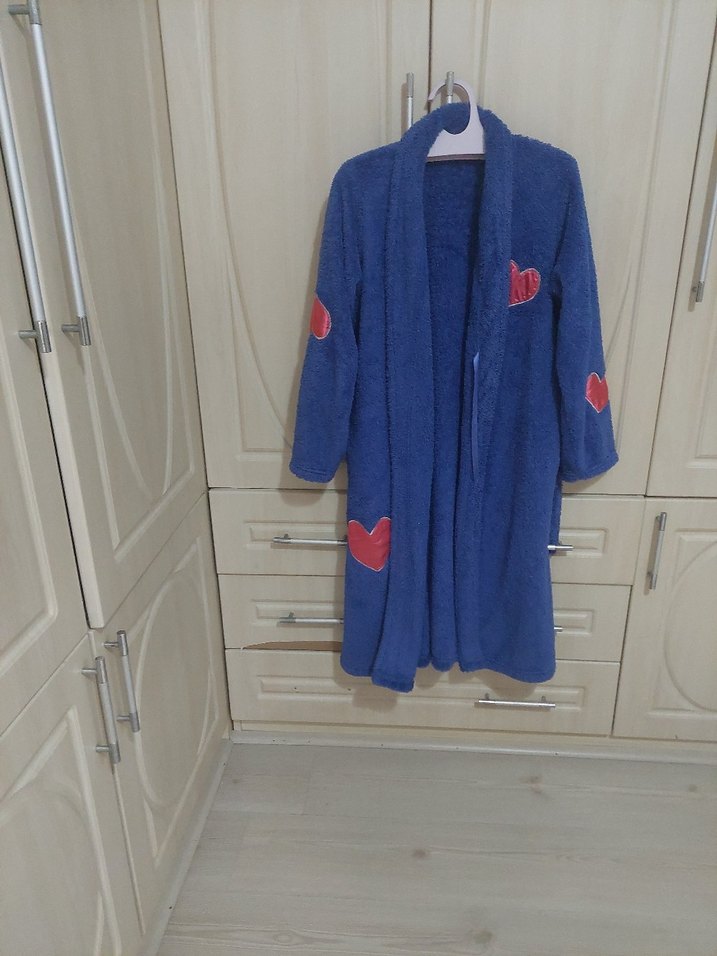Nakışlı kırmızı kalp desenleriyle süslenmiş lacivert erkek ve kız çocuk bornozu, yumuşak ve emici kumaştan üretilmiştir. sabahlık olarakta kullanılabilir sıcak ye yumuşacık
