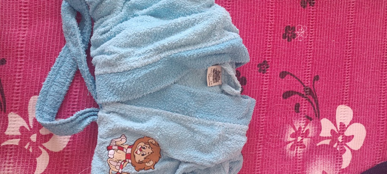 Yumuşak ve emici kumaştan yapılmış, renkli nakış detaylı mavi erkek çocuk bornozu.