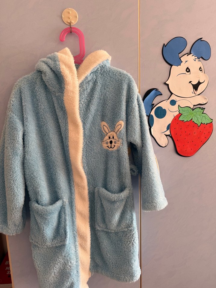Nakışlı tavşan detaylı, iki cepli, yumuşak ve sıcak dokulu pastel mavi erkek çocuk bornozu.