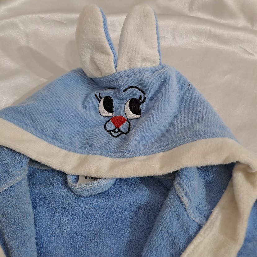 Mavi renkli, nakışlı detaylara sahip erkek çocuk bornozu, kapüşonunda tavşan kulakları bulunur, yumuşak ve emici kumaştan üretilmiştir. 9 10 yaş içindir