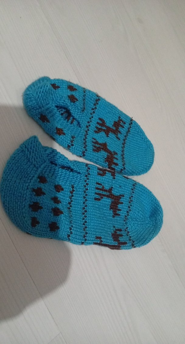 Renkli nakış desenlere sahip, yumuşak kumaştan üretilmiş mavi erkek çocuk çorabı.