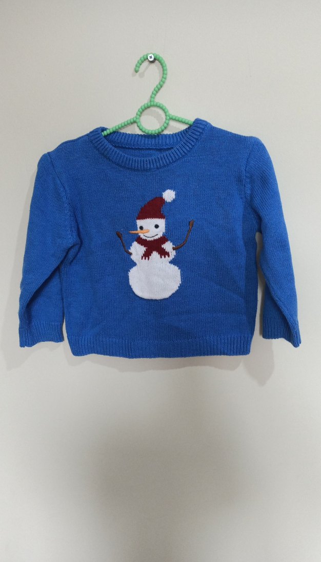 Nakışlı kardan adam deseniyle renkli mavi triko, uzun kollu ve bisiklet yaka. Erkek çocuklar için fit kesim, trend sokak stili kazak. ❄️