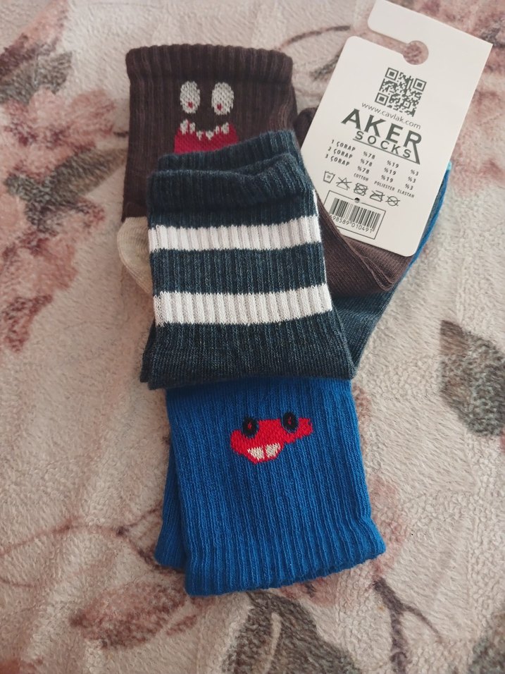 Nakışlı desenler ve çizgili modeller içeren, gri ve çok renkli 3'lü erkek çorap seti. Marka AKER.