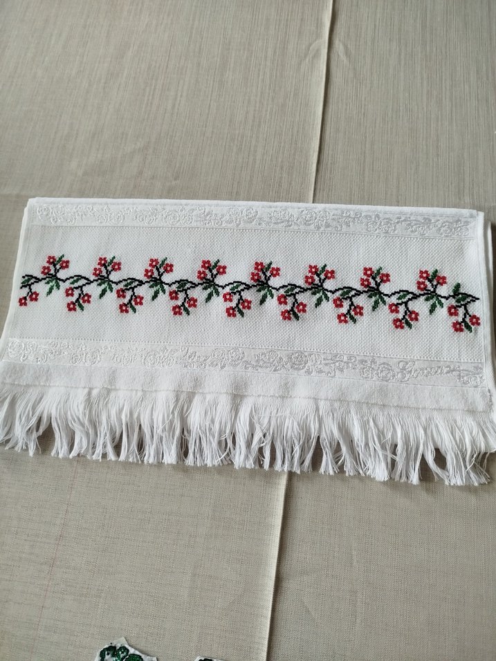 Renkli çiçek nakışları ve püsküllü detaylara sahip klasik beyaz havlu.