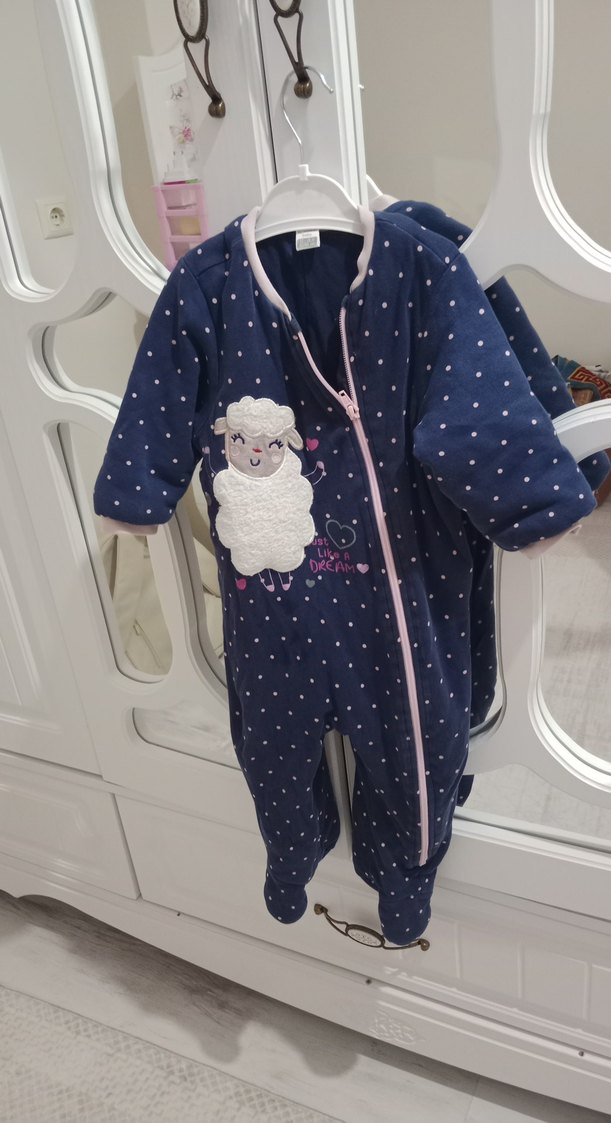Mavi zemin üzerine renkli nakışlı koyun figürlü, fermuarlı ve yuvarlak yakalı bebek kız tulumu. ❄️