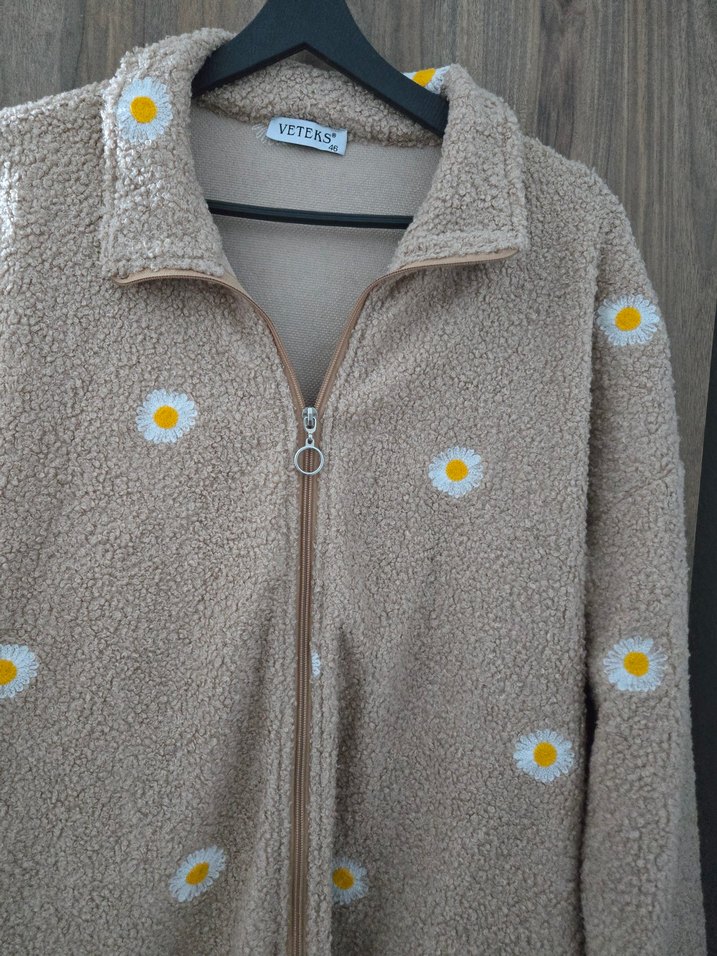 Nakışlı papatya desenli, fermuarlı bej renkli kadın ceket. Uzun kollu, yuvarlak yakalı, rahat kesim ve rahat bir günlük sokak stili sunar.