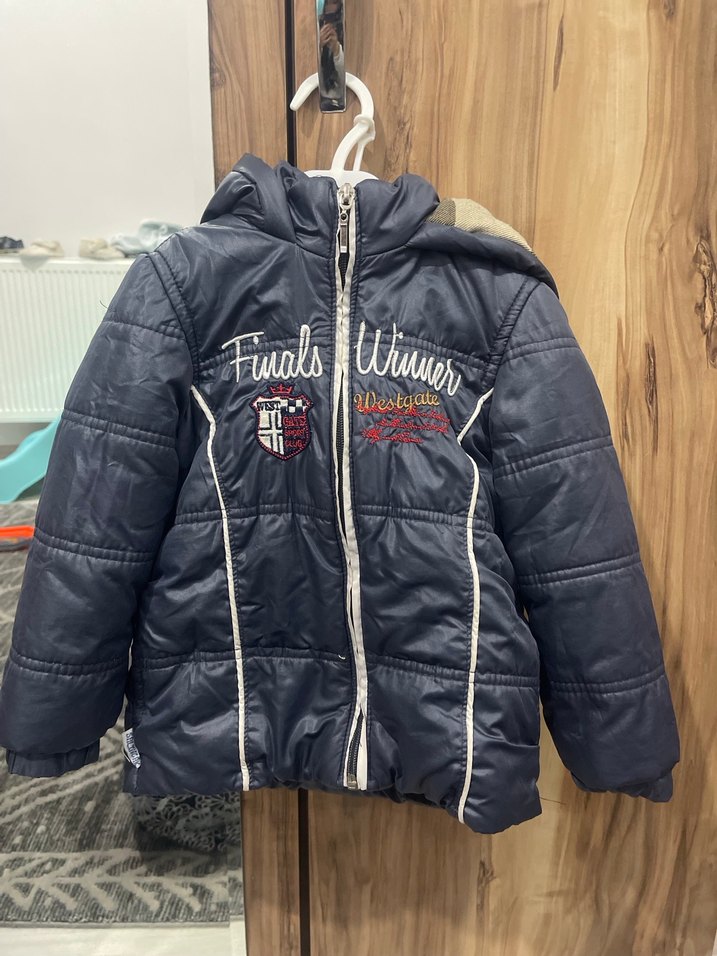 Fermuarlı, nakışlı detaylara sahip, gri renkli, yumuşak dokulu erkek çocuk montu. Notched lapel yaka ve dar kesim ile sokak stili için uygun.