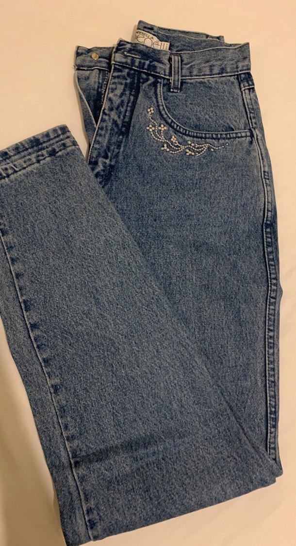 Gri mavi tonlarda, nakışlı ve fermuarlı detaylara sahip, bol kesim kot pantolon. Midi boy ve günlük sokak tarzına uygun.