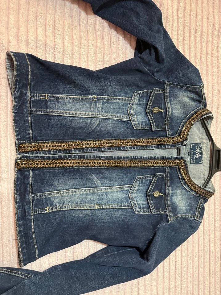 Fermuarlı, nakış detaylı ve notched lapel yakalı, lacivert kot ceket. Günlük ve sokak stili için uygun, vücuda oturan kesim.