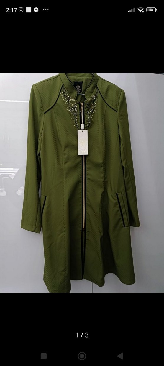 Kadınlar için uzun, nakışlı ve fermuarlı khaki kaban. Notlu yakalı, uzun kollu ve parlak sentetik kumaştan, günlük ve iş tarzına uygun.