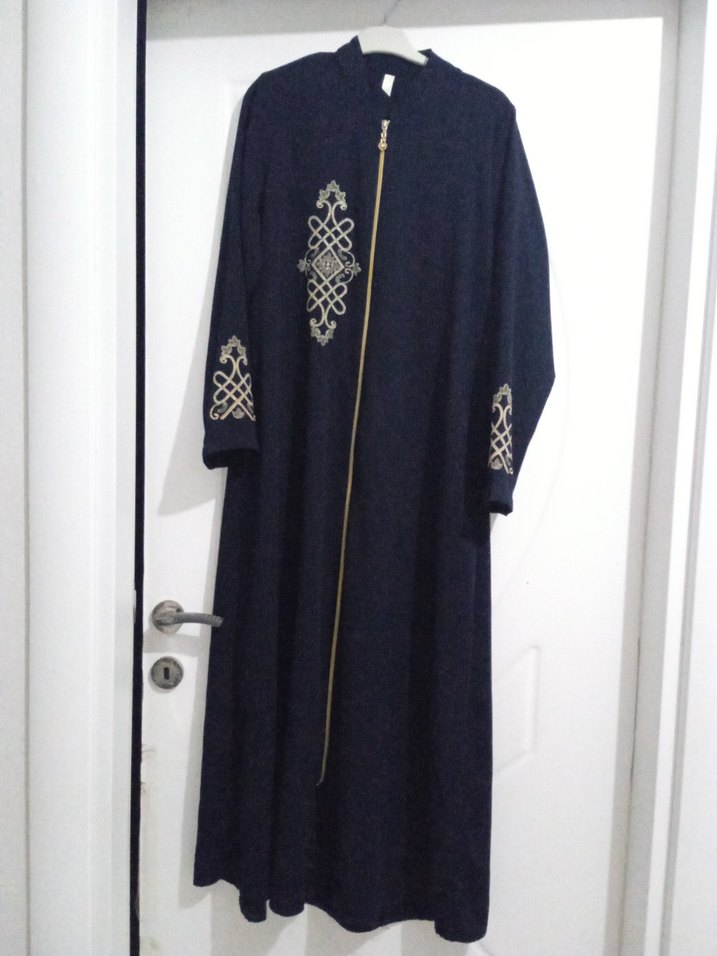 Uzun kollu, yakalı lacivert uzun elbise, nakış detaylı ve fermuarlı. Yumuşak ve sıcak kumaştan, rahat kesim.