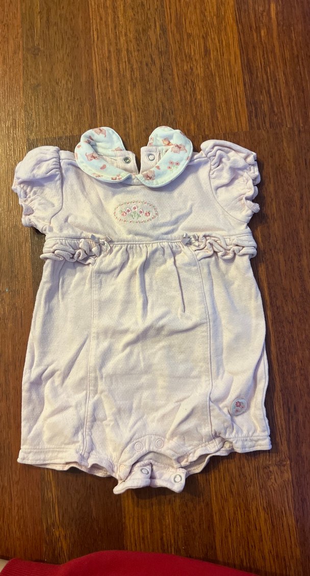 Pastel beyaz renkte, nakışlı detaylara ve yumuşak çiçek desenli yakaya sahip fırfırlı bebek kız tulumu.