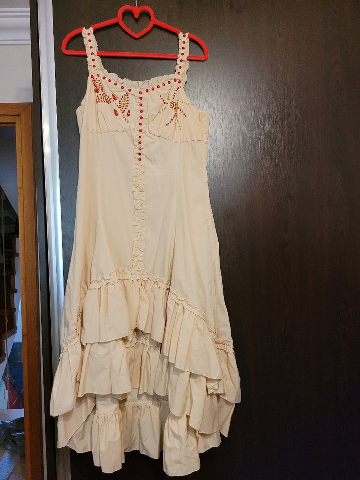 Nakışlı detaylara taş ve fırfırlara sahip bej renkte, askılı bohem uzun elbise. Yumuşak keten kumaştan, romantik buluşmalar için rahat ve bol kesim sadece bir iki kez giyildi.