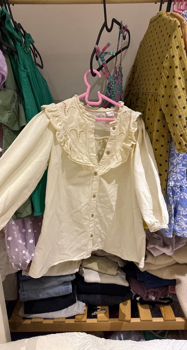 Pamuklu, nakışlı ve fırfırlı detaylara sahip beyaz, bol kesim uzun kollu kız gömleği. Bohem tarzı için uygun.