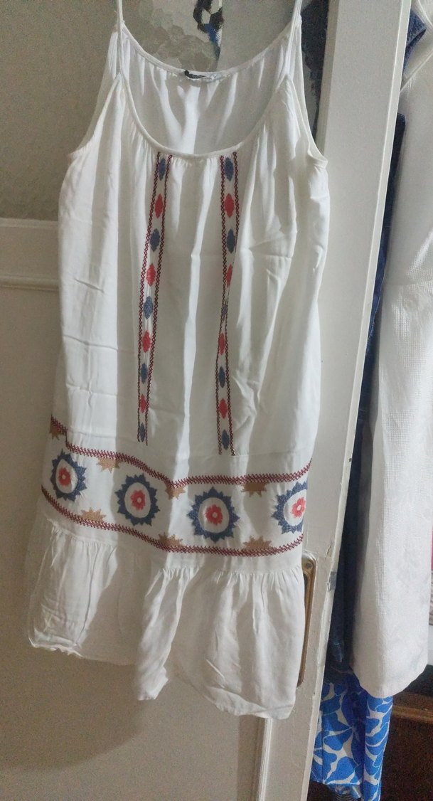 Nakışlı, Fırfırlı Beyaz Mini Elbise