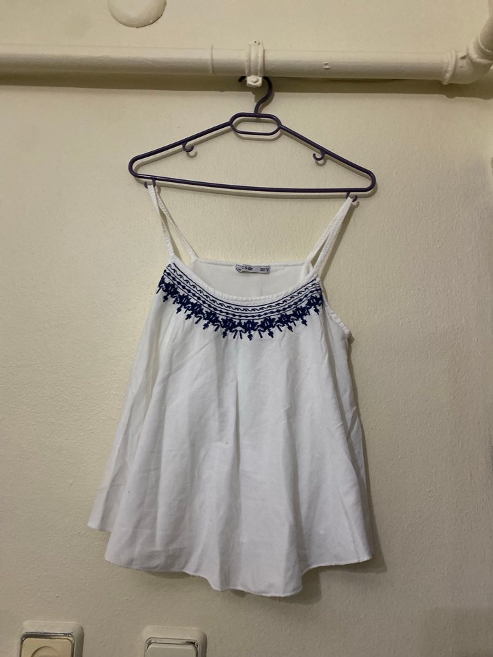 Nakışlı detaylara ve fırfırlara sahip, pamuklu, beyaz, askısız, bol kesim mini kadın bluz.
