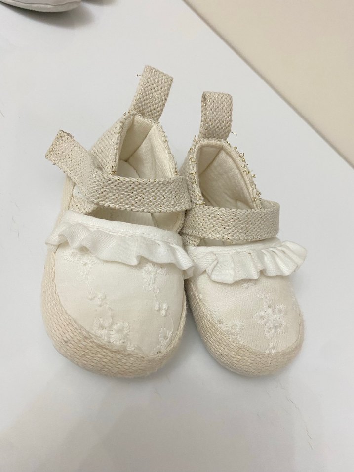 Nakışlı detaylara ve fırfır süslemeye sahip beyaz pamuk bebek ayakkabısı, yumuşak kumaş ve bohem tarzıyla klasik şıklık sunar.