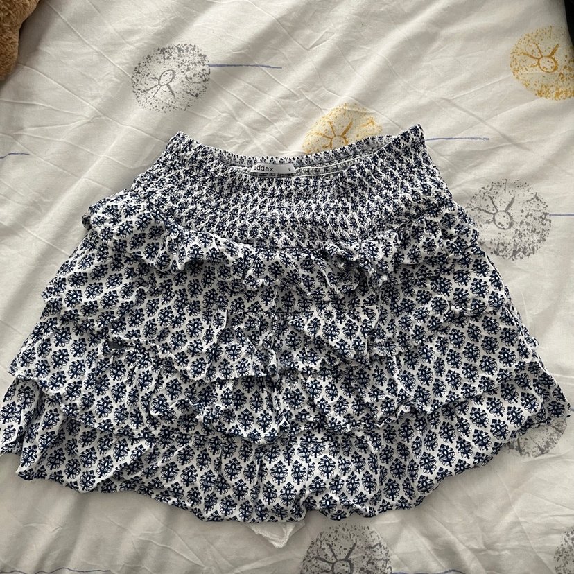 Pamuklu nakışlı kumaştan, fırfırlı ve bol kesim bohem tarzda kısa mini etek. Beyaz ve gri tonlarda, açık hava kullanımı için uygun.