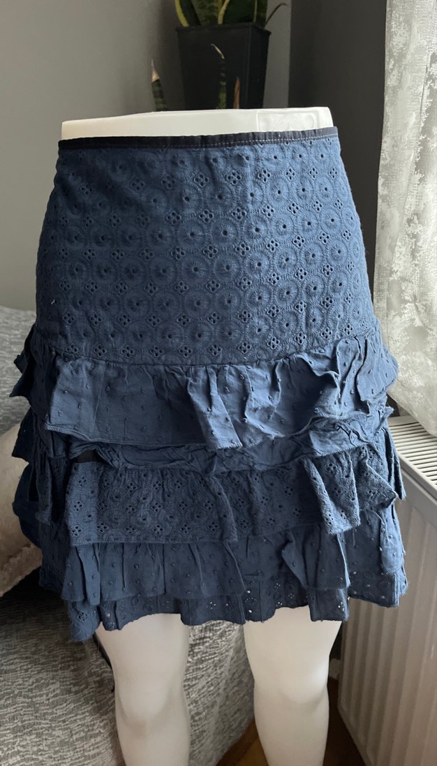 Nakışlı desenlere ve fırfırlara sahip bol kesim lacivert kot eteği, bohem tarzıyla romantik akşamlar için uygun.