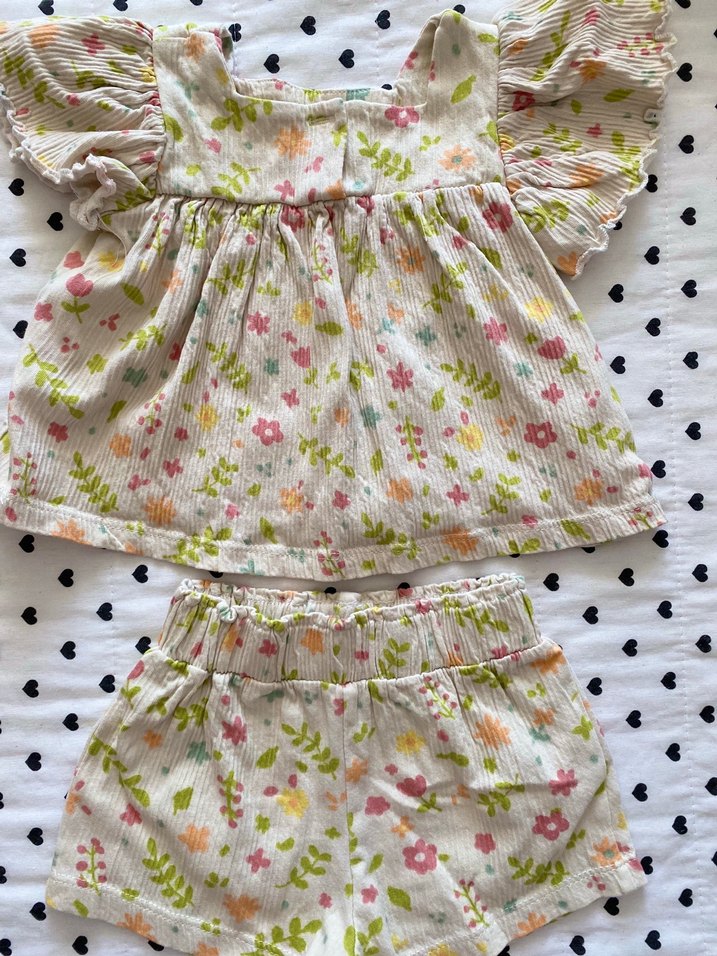 Nakışlı çiçek desenli, pastel renklerde kız bebek takımı. Fırfırlı kısa kollu, yumuşak ve rahat kumaştan.