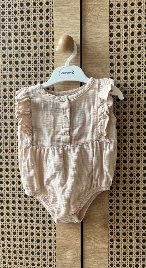 Nakış detaylı ve fırfırlı kollu bej kız bebek tulumu, yumuşak kumaştan üretilmiştir. Rahat oturuş sağlar.