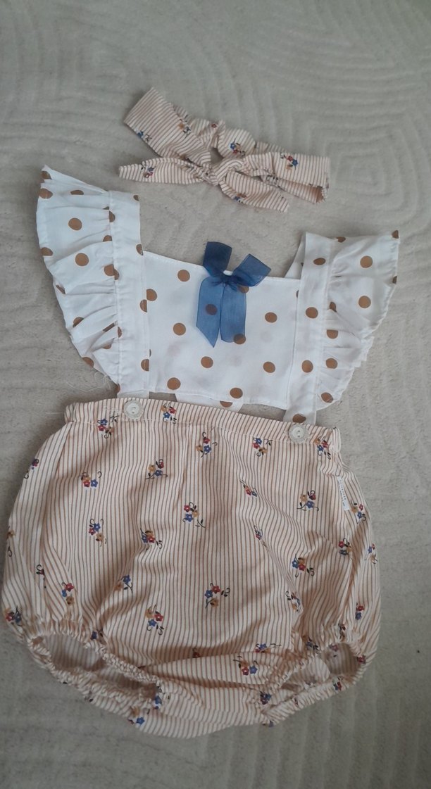 Bej pastel renkli kız bebek tulumu, nakışlı çiçek desenleri ve fırfırlı kollara sahiptir. Mavi fiyonk ve uyumlu saç bandı ile tamamlanmıştır.