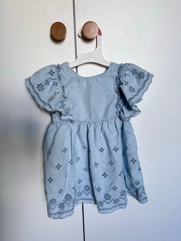 Yumuşak, kısa fırfırlı kollu, nakış detaylı ve bol kesimli kız çocuk elbisesi, pastel mavi renkte.