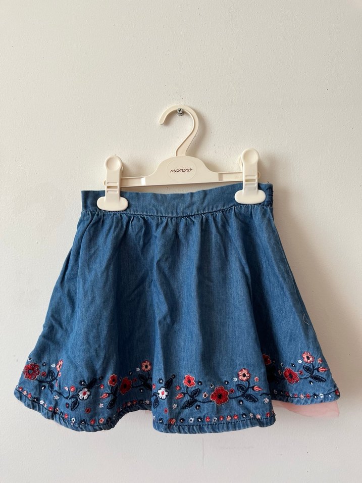 Renkli nakışlı çiçek desenleri ve fırfır detaylarıyla bohem tarzda, kız çocuk denim eteği. İç kısımda biraz tiftiklenme var gözükmüyor zaten.