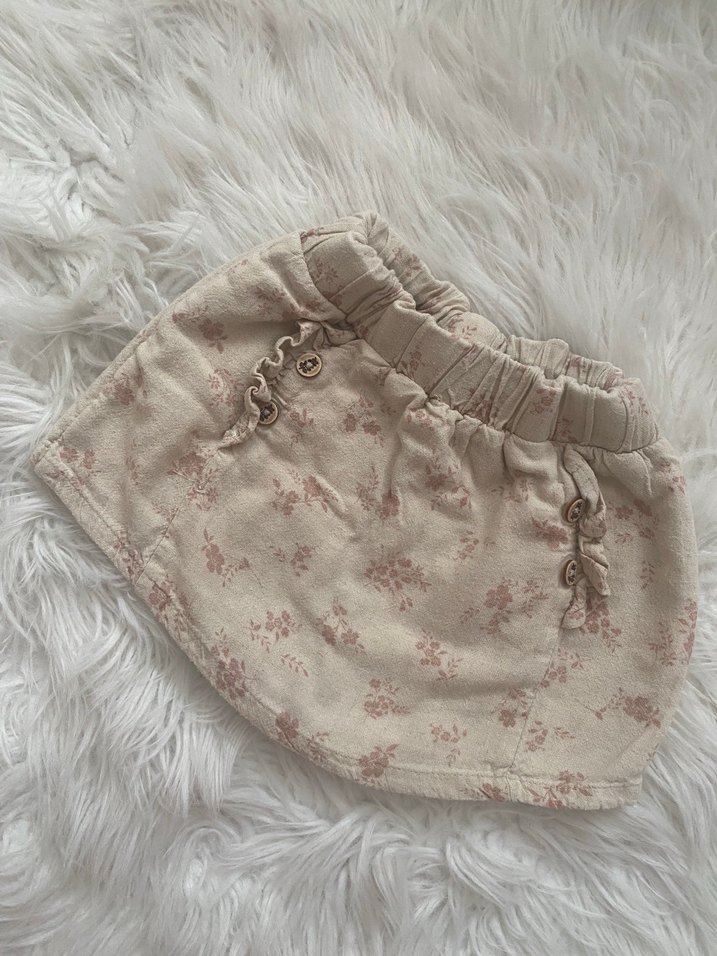 Nakışlı çiçek desenli, fırfırlı detaylı bol kesim bej keten kız eteği, bohem tarz sunar.