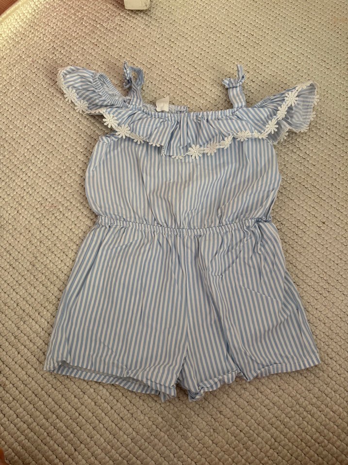 Pamuklu, bol kesim, askılı mavi tulum. Nakışlı fırfır detayları ve pastel çizgili desenle sokak stiline uygun.