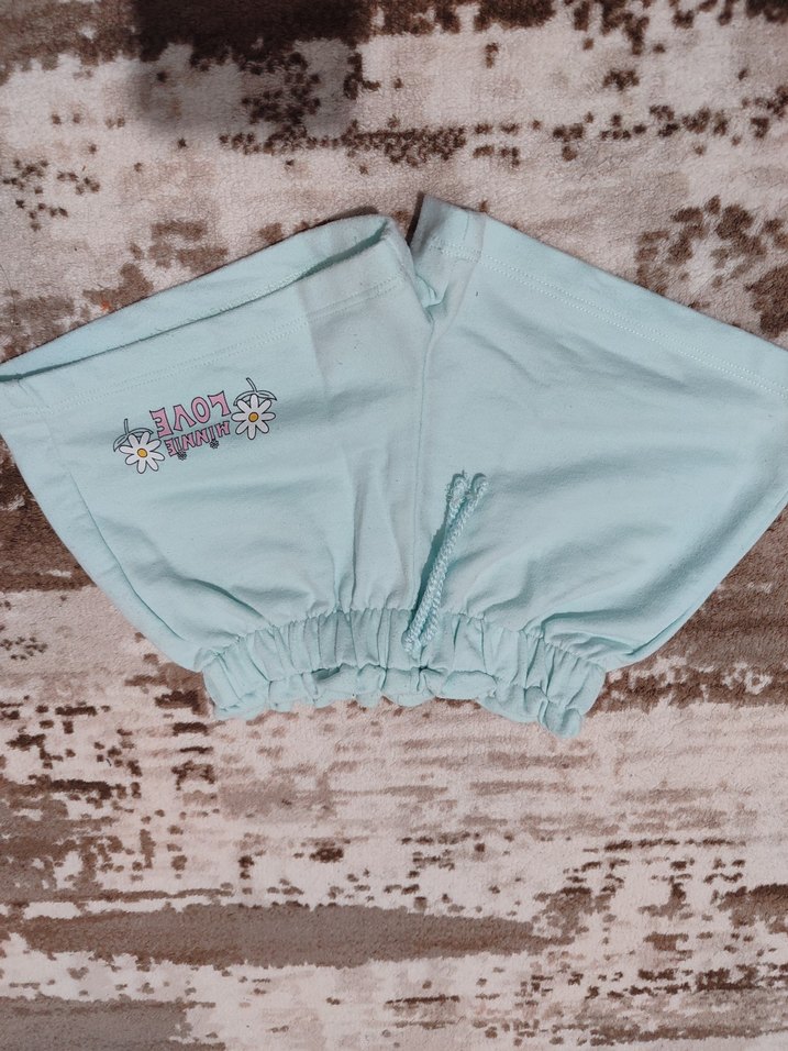 Pastel mavi renkte, nakışlı çiçek detayları ve fırfır süslemeleri olan, bol kesim ve yumuşak kumaşlı kız şortu.