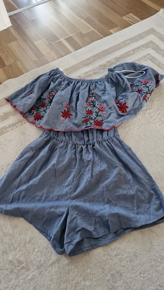Nakışlı çiçek desenleri ve fırfır detaylı, askısız tulum. Bol kesim, kısa kollu ve bohem tarzda, günlük kullanıma uygun.