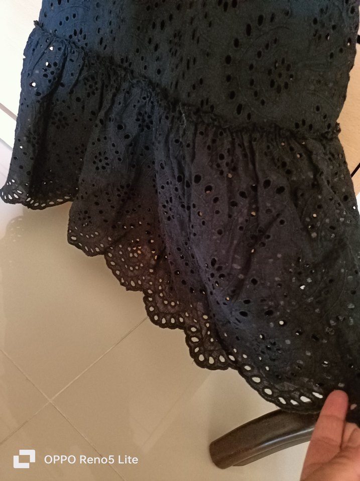 Nakışlı desenli, fırfırlı, pamuk li kumaştan yapılmış siyah midi boy elbise. Rahat kesimiyle gotik tarzda, romantik akşamlar için uygun. marka temsili
