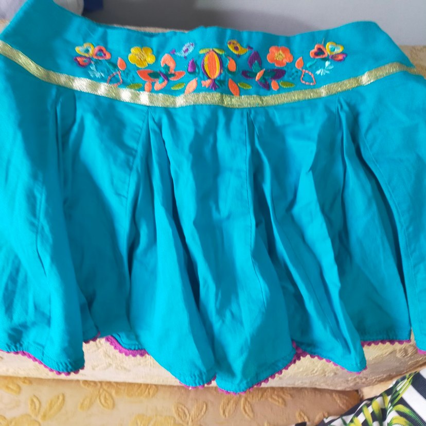 Turkuaz renkli, nakışlı ve fırfırlı detaylara sahip bol kesim kız eteği, bohem tarzını yansıtıyor. beli lastik ayarlı