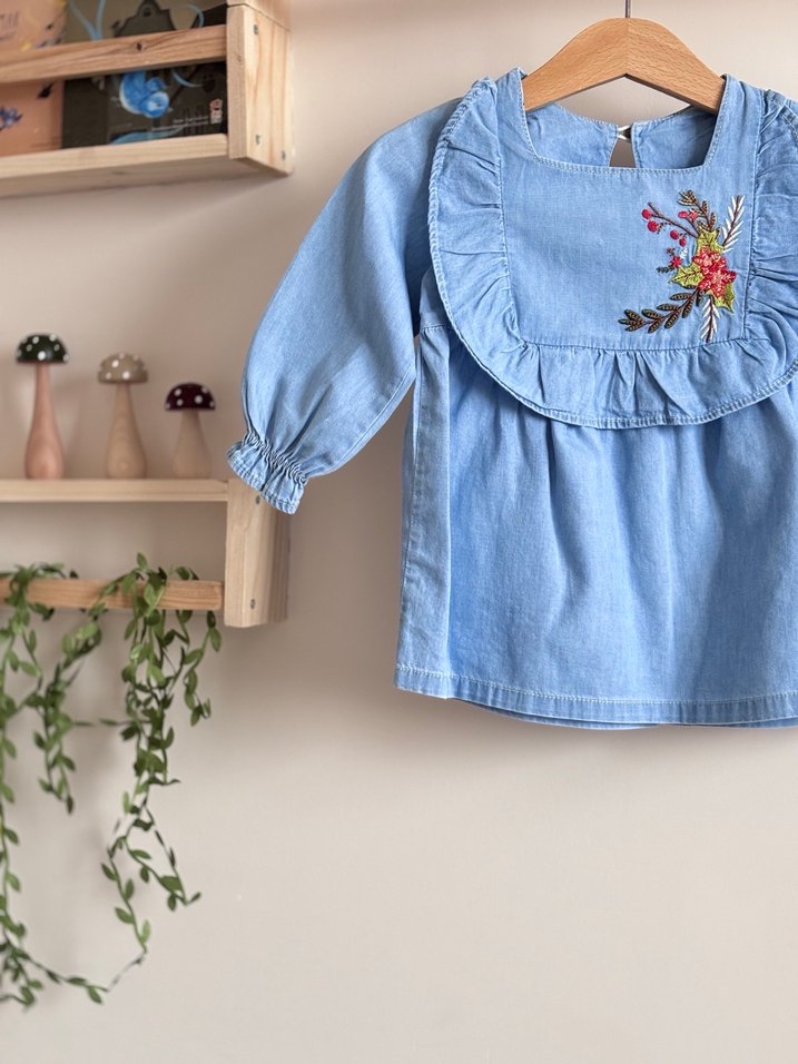 Ürün bedenleri: 9 ay, 12 ay, 18 ay Pastel mavi renkli, bol kesim, kot kumaştan yapılmış, yakalı, uzun kollu, fırfırlı ve nakışlı kız elbisesi.