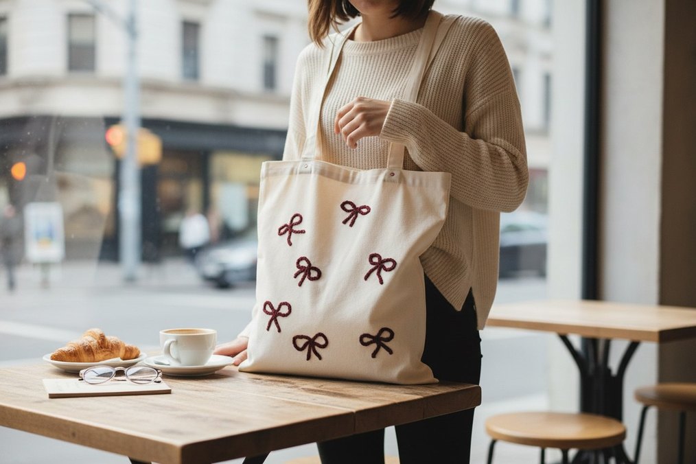 Bej renkli, örgü kumaştan yapılmış bu çanta, nakışlı fiyonk desenleri ve rahat bohem tarzıyla günlük kullanıma uygundur.