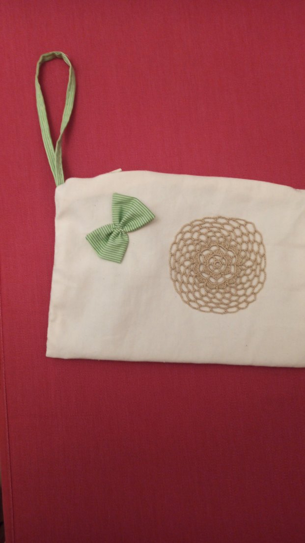 Krem tekstil malzemeden yapılmış, dantel ve yeşil fiyonk detaylı, vintage bohem tarzında bir makyaj çantası