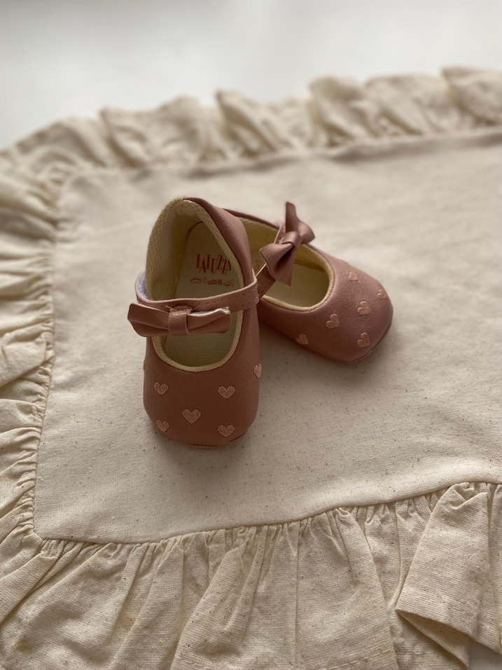 Minik prensesinizin ilk adımlarına zarafet katacak, fiyonk detaylı ve kalpli deseniyle göz alıcı bir model 18 numaradır, sıfır üründür — hiç kullanılmamıştır. Tertemiz, hasarsız ve kutu gibi bir ayakkabı