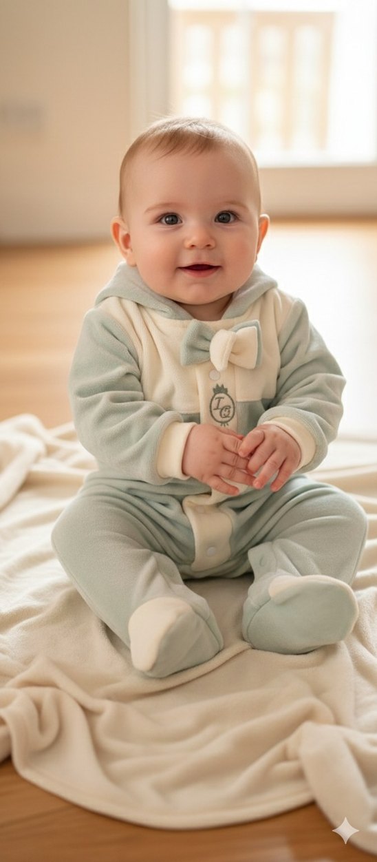 Uzun kollu, bisiklet yaka ve nakışlı desenli fiyonklu bebek tulumu. Yumuşak ve sıcak kumaştan, pastel renklerde rahatlık sağlar.