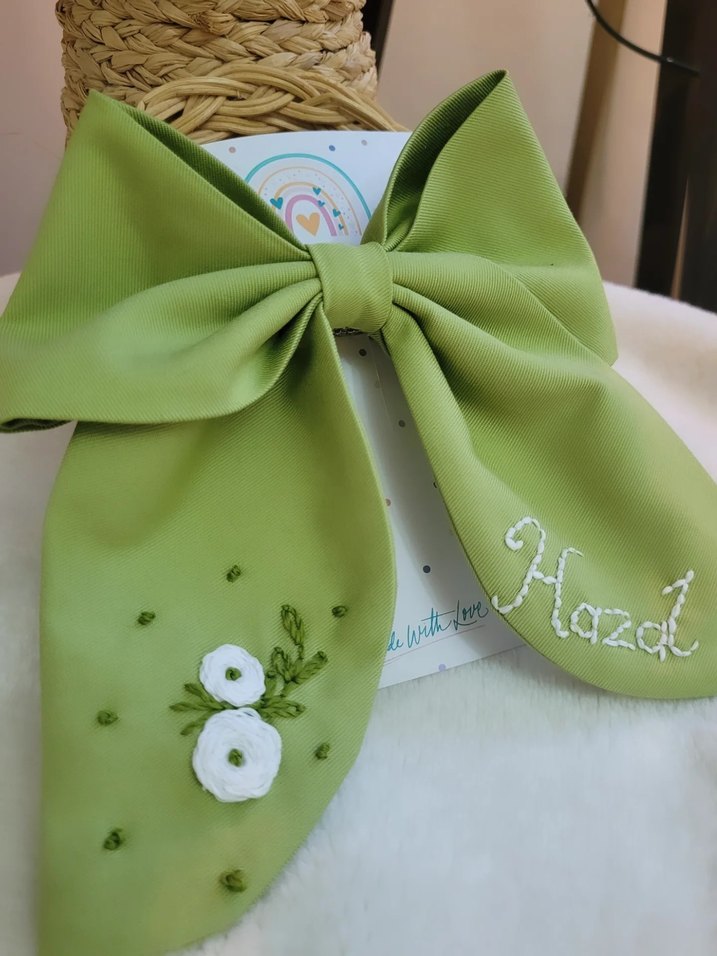 Pastel yeşil renkte, nakışlı çiçek detaylı ve bir tarafında 'Hazal' ismi işlenmiş fiyonklu saç bandı.