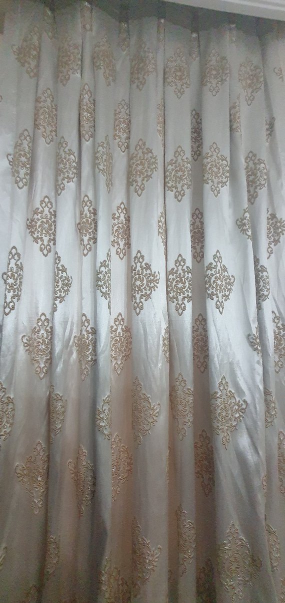 Parlak kumaş ve nakışlı desenlere krem rengi çifti vardır fon perde iksinin fiyatıdır en 110 boy 270. ✨