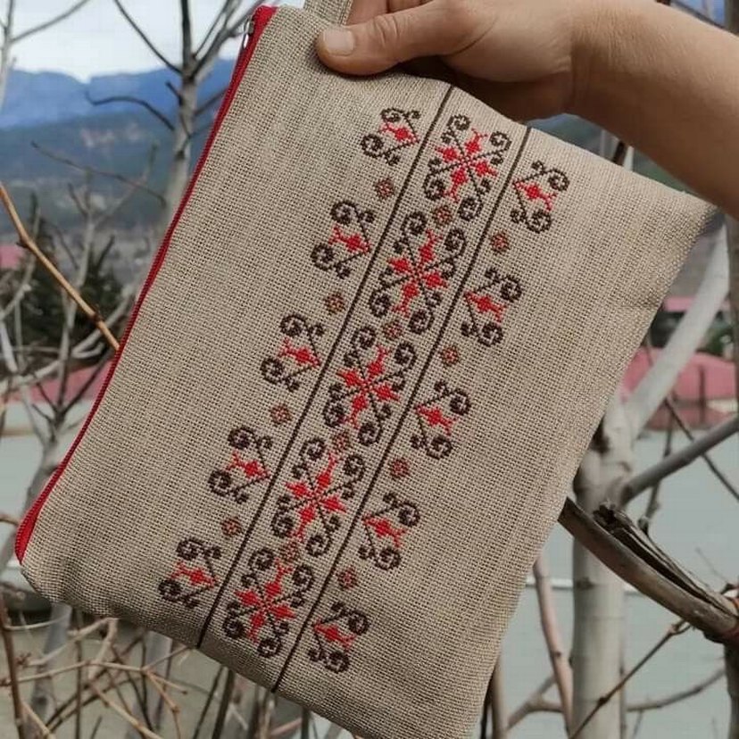 Kırmızı fermuarlı, bej kumaş üzerine kırmızı ve kahverengi nakışlı geleneksel el çantası. Özenli desenlerle kültürel bir dokunuş sağlar. İstediğiniz model ve ölçüde yapabilirim
