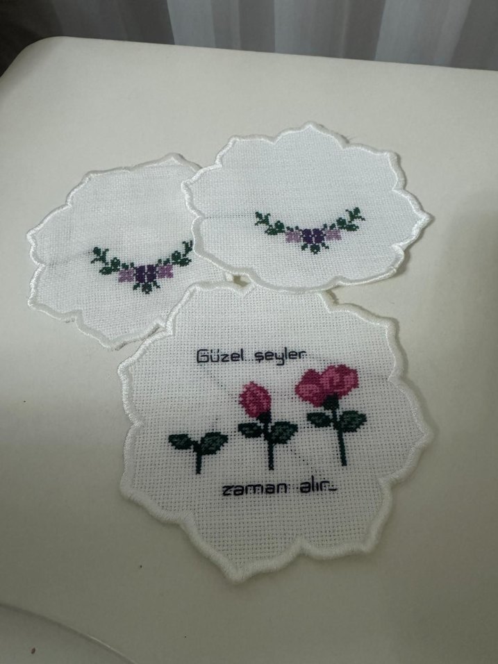 Çiçek desenli ve "Guzel seyler, zaman alir" yazılı nakışlı geleneksel kumaş peçeteler. sipariş üzerine de yapabilirim. isteğe göre modeller de yapıyorum. Üçlü fiyattır