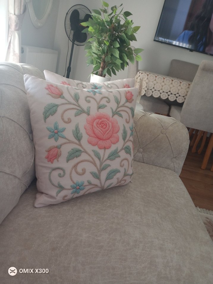 Krem zemin üzerine pastel renklerde işlemeli çiçek desenleri bulunan nakış görünümlü yastık, kılıfı mekana zarif bir dokunuş katıyor. yumuşak ve şık bir dekor ürünü.